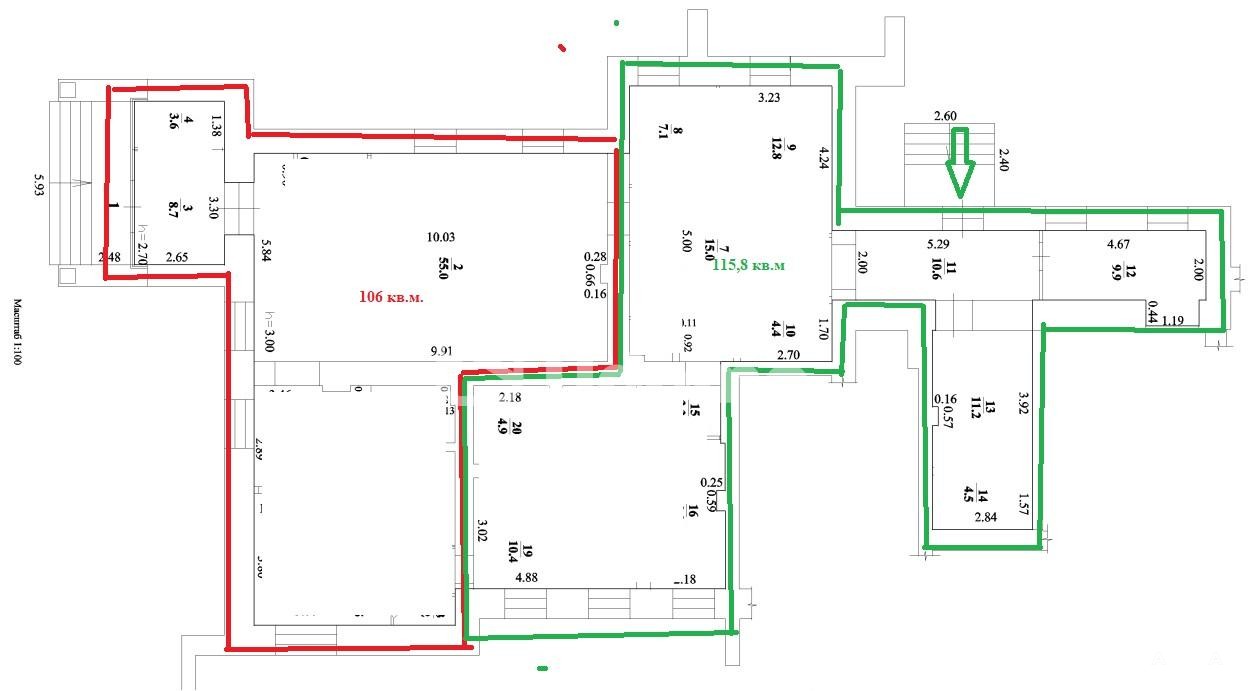 Площадь 221, 8 кв.м., которая делиться на 2 - 106 кв.м. и 115, 8 кв.м., более мелкое деление обсуждается